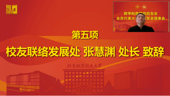 校友联络发展处处长张慧渊致辞,他对学院上一届校友会的辛苦付出表示感谢,对数学学院校友会的工作表示肯定,他表示,希望学院新一届校友会能够充分发挥联系校友、凝聚力量的优势,架起学校与校友的桥梁。他同时寄语各位校友,希望各位校友能够发挥“三帮”精神,积极参加学院和校友会组织的各项活动,为学校、学院和校友会的发展建言献策,争取把数学学院校友会建设成为学校校友工作的桥头堡和生力军。