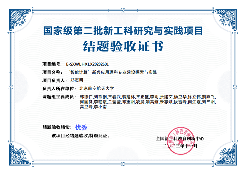 国家级第二批新工科研究与实践项目:“智能计算”新兴应用理科专业建设探与实践(项目编号:E-SXWLHXLX20202601),由pp电子官方网站pp电子官方网站牵头,联合南京航空航天大学理学院、电子科技大学pp电子官方网站、西安电子科技大学数学与统计学院、太原理工大学数学学院、高等教育出版社、杭州电子科技大学理学院和桂林电子科技大学数学与计算机科学学院共同实施。课题研究总体时间为三年(从2020年2月-2022年11月),现通过结题验收,验收结论为优秀。