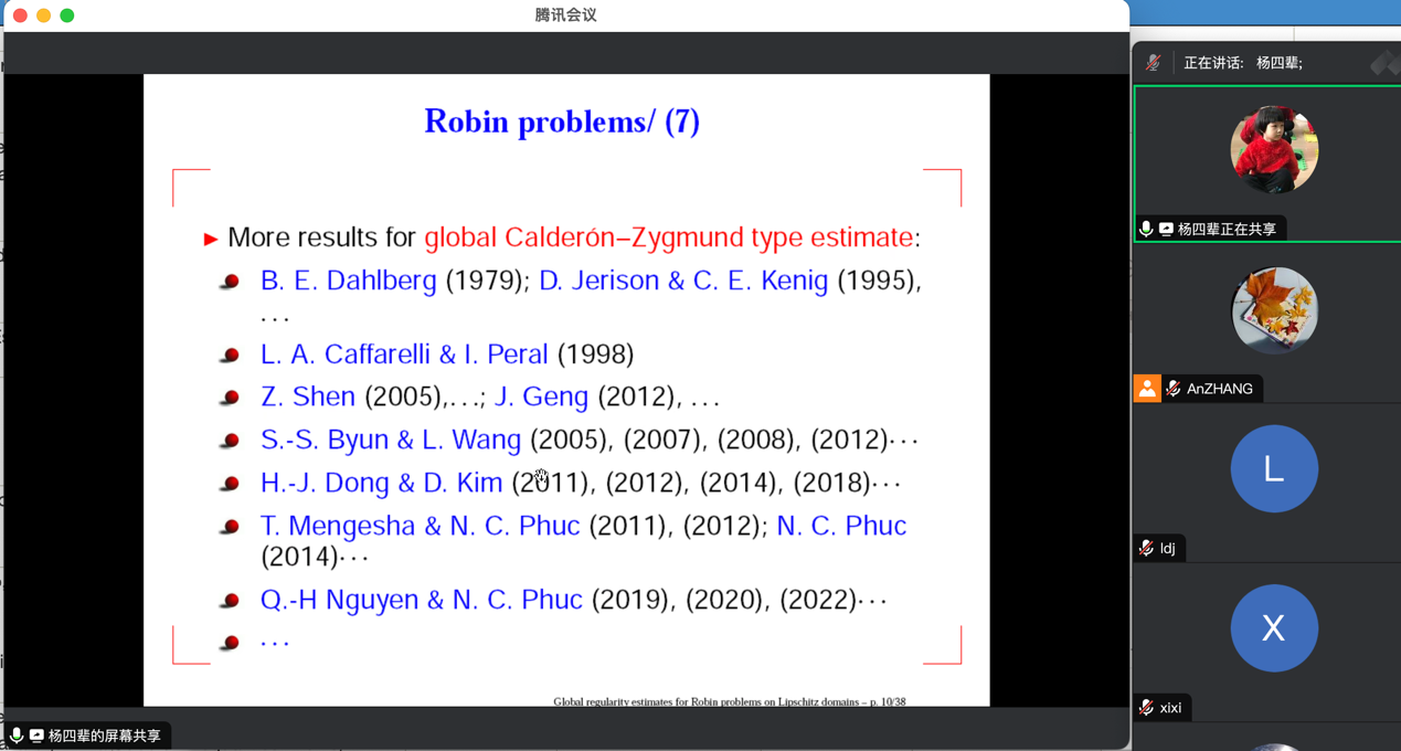 本次报告,杨老师介绍了 Lipschitz 域上具有 Robin 边界条件的椭圆算子相关的 Hardy 空间的实变量刻画的一些最新结果,以及 Lebesgue 空间和 Hardy 空间上具有 Robin 边界条件的椭圆算子相关的 Riesz 变换的有界性。 作为应用,进一步获得了非齐次 Robin 问题在 Lebesgue 空间和 Hardy 空间中的全局正则性估计。