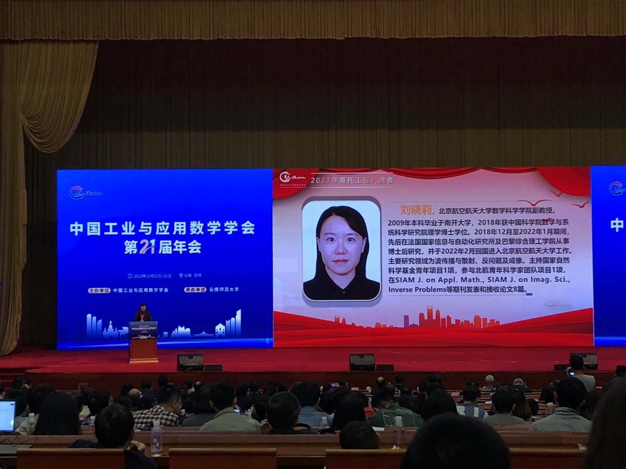 2023年10月13日,中国工业与应用数学学会(英文缩写CSIAM)第二十一届年会(CSIAM 2023)在昆明开幕。会上公布了入选学会2023年青年人才托举工程的青年学者名单,并颁发了青托证书。我院刘晓莉副教授入选青托女性项目,项目名称为“反散射数学理论与计算方法”。