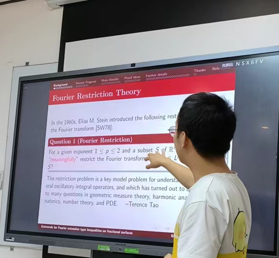 2023年06月20日,中国科学院大学邸博宁博士,应邀为pp电子官方网站师生做了题为 “Extremals for Fourier extension type inequalities on fractional surfaces”的学术报告。报告由张安老师主持。