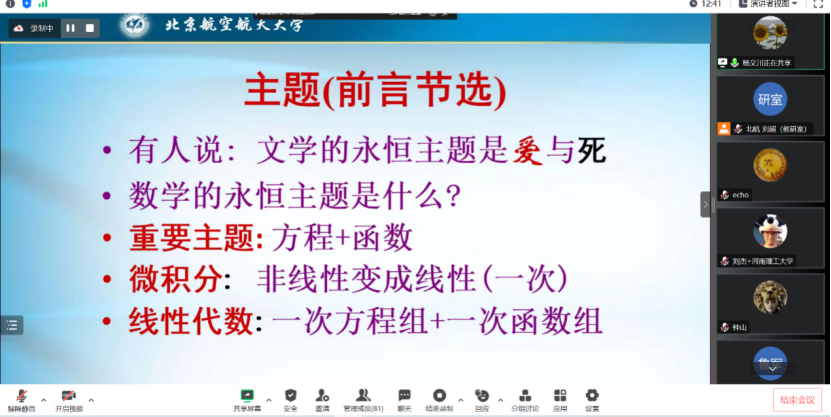 2023年5月17日下午,教育部“面向人文社科学生的大学数学课程群虚拟教研室(中国人民大学牵头)”邀请了国家级教学名师、北京航空航天pp电子官方网站李尚志教授作了“线性代数启蒙”的讲座。该讲座由作为虚拟教研室主要成员单位的pp电子官方网站组织,通过虚拟教研室面向虚拟教研室全体成员以及有关高校教师直播。教育部“面向人文社科学生的大学数学课程群虚拟教研室”牵头人中国人民大学龙永红教授、吉林大学张然教授以及来自国内多所兄弟院校的80余位师生参加了学习交流。讲座伊始,中国人民大学数学学院黄志勇副院长做了热情洋溢的开场主持。