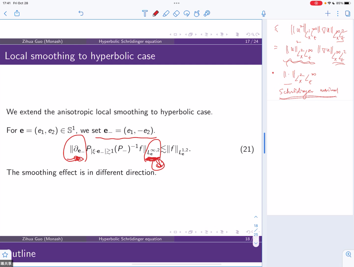 报告主要介绍了二维双曲Schrodinger方程的全局适定性和散射性质。报告人首先介绍了Schrodinger方程适定性研究的一些历史和已经取得的经典结果,介绍双曲情形和抛物情形的一些共同和不同点,如方程的伸缩不变性、Strichartz 估计和局部光滑效应。通过在双曲情形得到新的局部光滑估计结合广义的Strichartz估计最终证明了2维带3次导数和小初值的双曲Schrodinger方程在临界Besov空间的整体适定性。参会老师就报告内容行了热烈讨论交流。