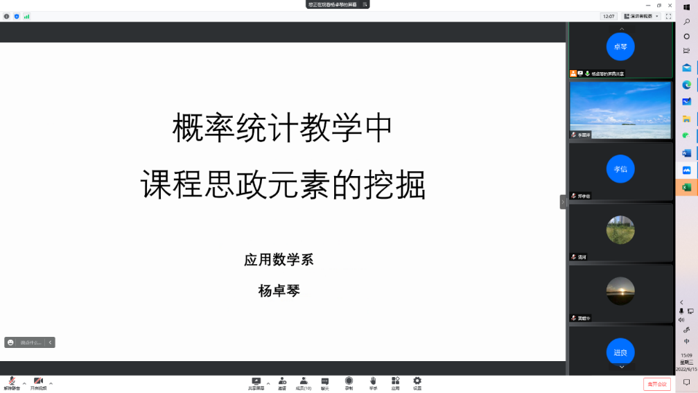 2022615日下午,应用数学系党支部继续开展“人人讲党课”系列报告,支部党员杨卓琴老师以自身教学工作与课程思政相结合为出发点,进行了“概率统计教学中课程思政元素的挖掘“为主题的党课报告。应用数学系支部全体党员参加了此次活动并积极交流了学习本次报告的心得体会,本次活动丰富了支部学习日活动内容,使得支部教师对课程思政在教学工作中的重要作用有了更深层次的认识和领悟。
