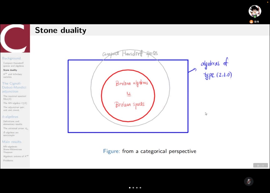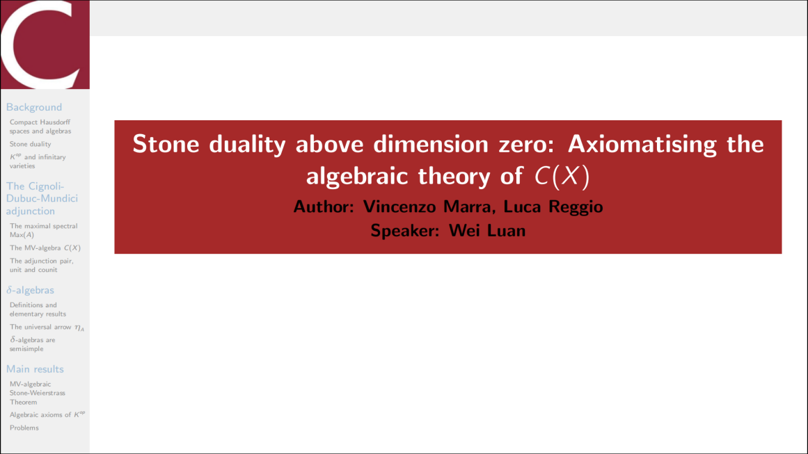 报告主要介绍了Marra和Reggio近期的突破性成果。该成果通过改造Chang引入的MV代数,建立了δ-代数,解决了紧豪斯道夫空间的代数公理刻画这一著名公开问题。栾伟博士首先从范畴论的视角介绍了该公开问题的由来,之后分析了δ-代数的引入动机,并简要介绍了代数公理刻画的主要证明思路,最后阐明了该工作的重大意义。