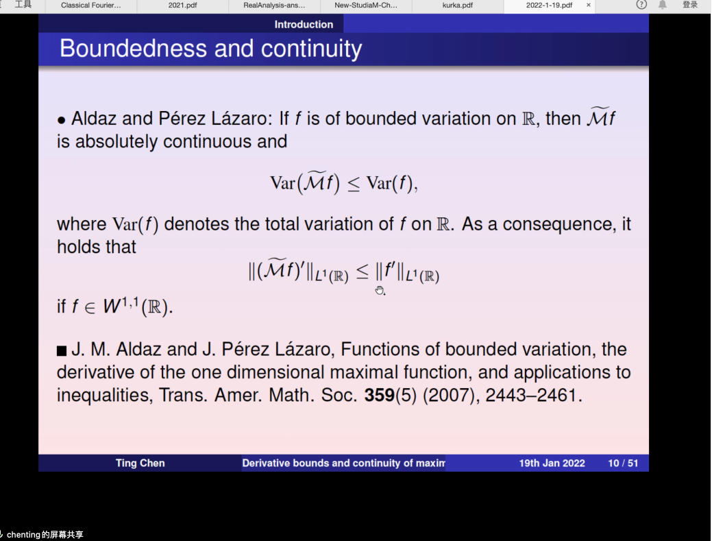 2022年01月19日下午,南开大学数学学院陈婷老师应邀为pp电子官方网站师生做了题为 “Derivative bounds and continuity of maximal commutators”的学术报告,报告由张安老师主持。