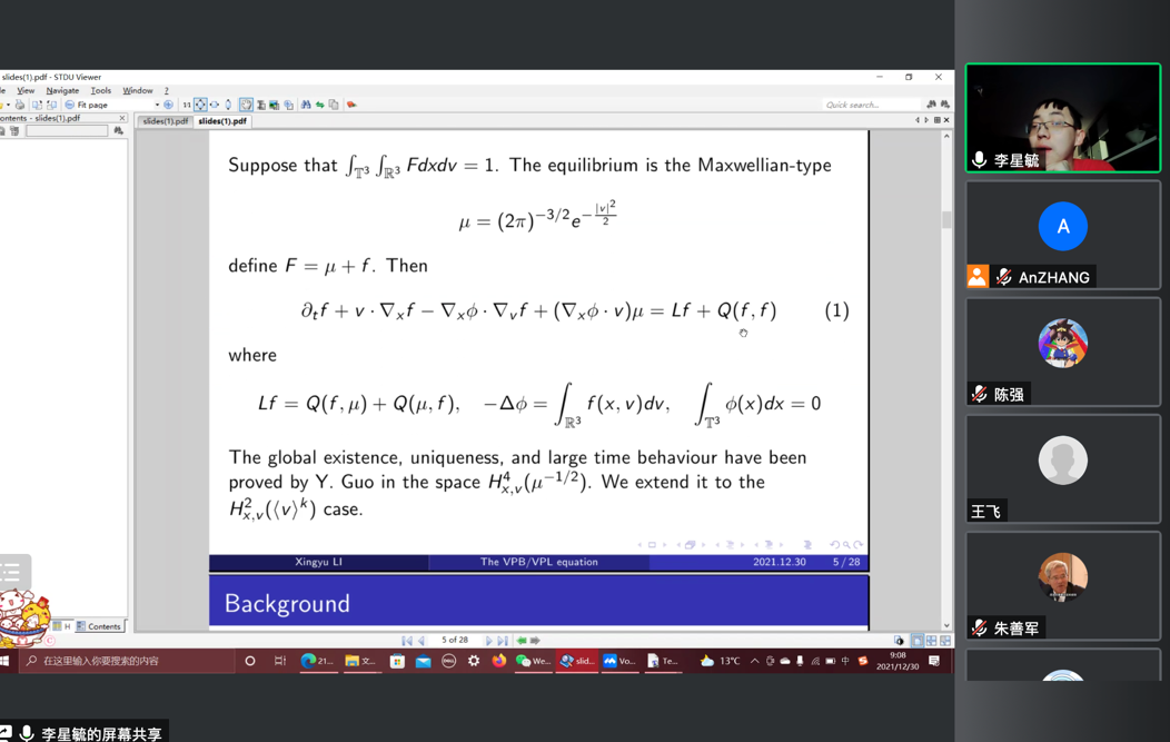 2021年12月30日下午,巴黎第九大学李星毓博士,应邀为pp电子官方网站师生做了题为 “The Vlasov-Poisson-Boltzmann/Landau equation with polynomial perturbation near Maxwellian”的学术报告,报告由任天一和张安老师主持。