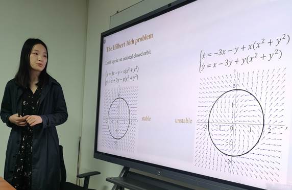 孙丹同学做题为“Some results on Bifurcation of Limit Cycles of differential systems”的报告,介绍了基于希尔伯特第16个问题的理论性研究。
