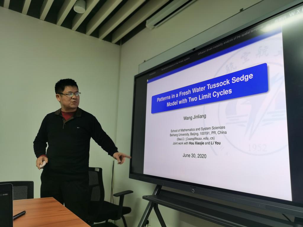 王进良老师做题为“Patterns in a Fresh Water Tussock Sedge Model with Two Limit Cycles”的报告,介绍了基于实际应用领域中提取出的数学问题。