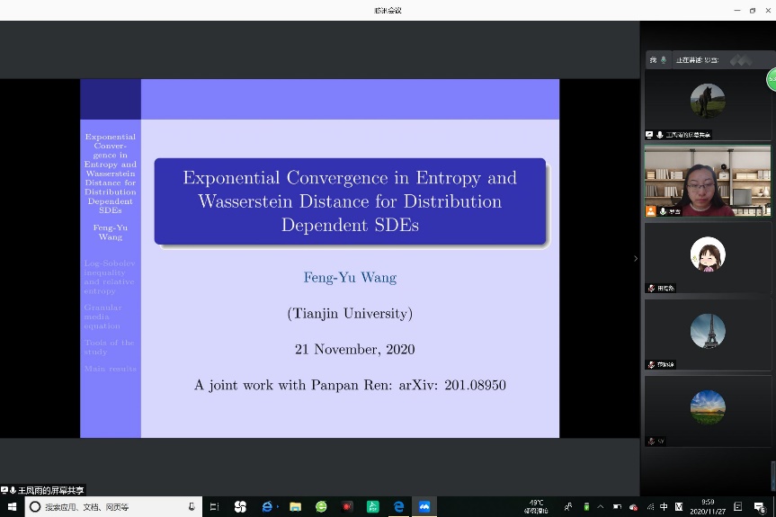 2020年11月27日上午,国家杰出基金获得者、长江特聘教授王凤雨教授受邀为pp电子官方网站师生带来了一场题为:“Exponential Convergence in Entropy and Wasserstein Distance for Distribution Dependent SDEs ”的学术报告。报告由pp电子官方网站统计与运筹系系主任罗雪副教授主持。