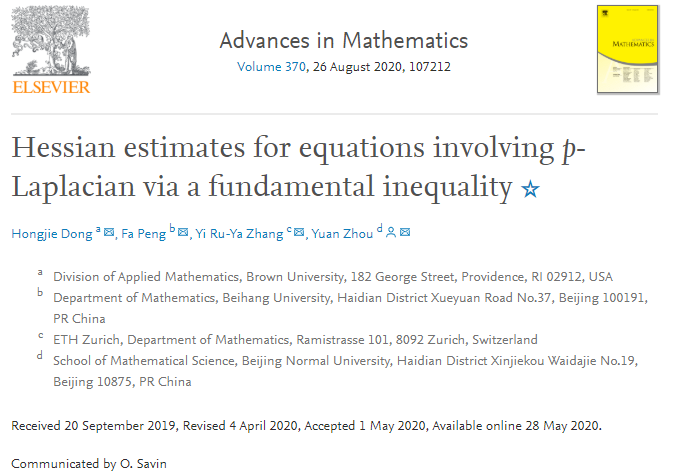 2020年8月26日,国际顶级综合性数学杂志《Advances in Mathematics》在线刊登了pp电子官方网站pp电子官方网站2018级博士研究生彭发及其导师周渊等人在非线性退化方程研究方面的最新进展:《Hessian estimates for equations involving p-Laplacian via a fundamental inequality》。(论文链接:https://www.sciencedirect.com/science/article/pii/S0001870820302383)