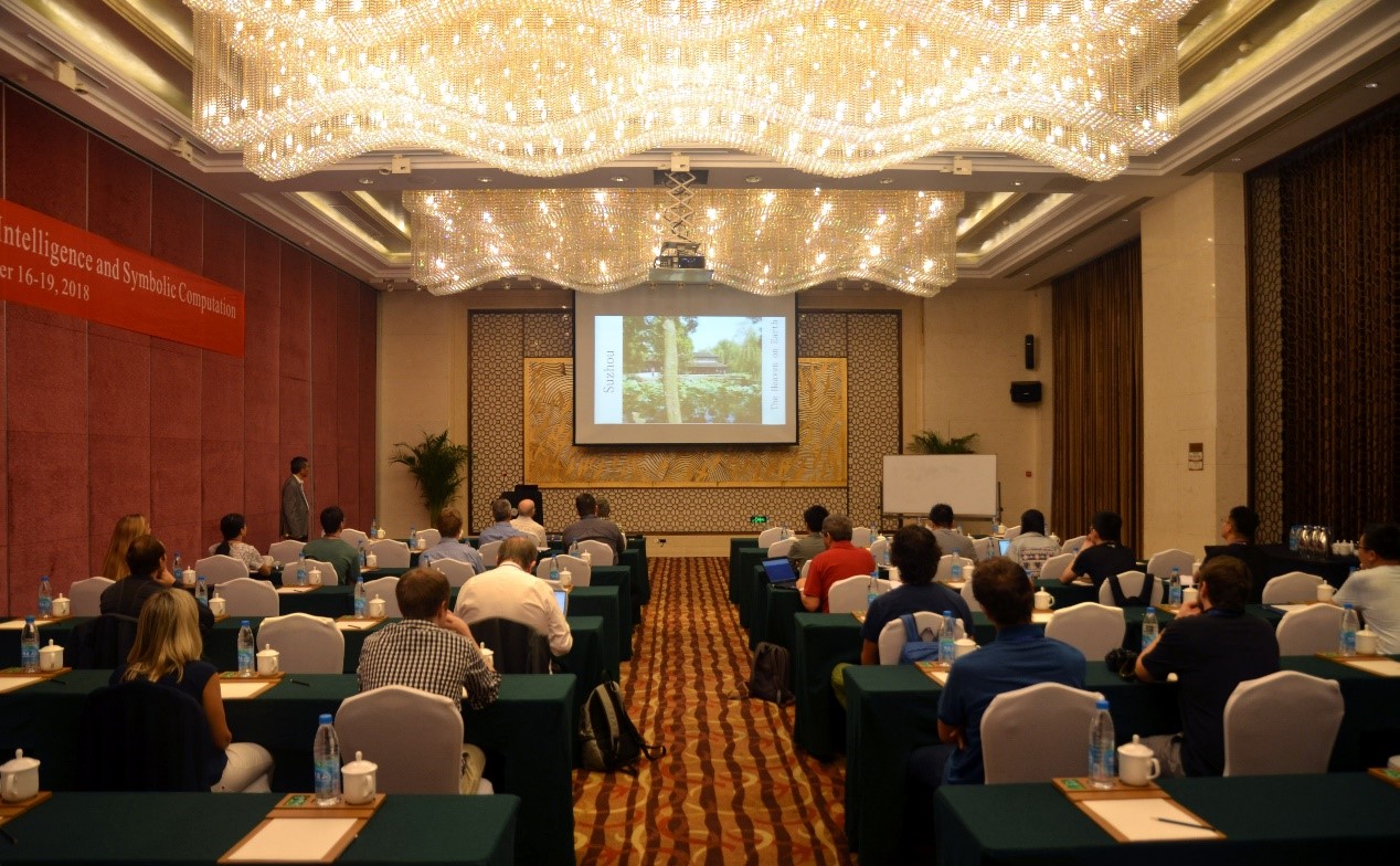 9月16日至19日,由pp电子官方网站和北航苏州创新研究院主办的第13届国际人工智能与符号计算会议(13th International Conference on Artificial Intelligence and Symbolic Computation,AISC 2018)在苏州清山会议中心召开。会议由欧洲科学院院士、pp电子官方网站教授王东明和德国卡尔斯鲁厄理工学院教授Jacques Calmet担任大会主席,英国爱丁堡大学教授Jacques Fleuriot担任程序委员会主席。英国皇家科学院院士、爱丁堡大学教授Alan Bundy、欧洲科学院外籍院士、南京大学教授周志华、纽约大学库朗研究所教授Chee K. Yap作大会特邀报告,英国巴斯大学教授James H. Davenport、加拿大劳里埃大学教授Ilias S. Kotsireas、奥地利因斯布鲁克大学教授Cezary Kaliszyk和pp电子官方网站陈肖宇博士作分会邀请报告。国内外近五十名专家学者参加了会议。