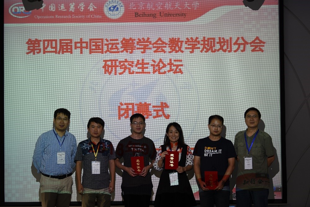 9月23日下午学术报告结束后,举行了简短的闭幕式,由pp电子官方网站数学与系统科学学院夏勇教授主持。本次论坛从23位研究生报告中评选出三位优秀成果奖,香港中文大学的刘慧康、浙江大学的甘进翔、中国科学院数学与系统科学研究院的陈雅丹获此殊荣。由文再文研究员、夏勇教授、刘亚锋研究员分别颁发优秀成果奖证书,每位获奖者另有奖金1000元以资鼓励,由杉树科技公司特别赞助。最后在与会代表的热烈掌声中,本次研究生论坛圆满结束。