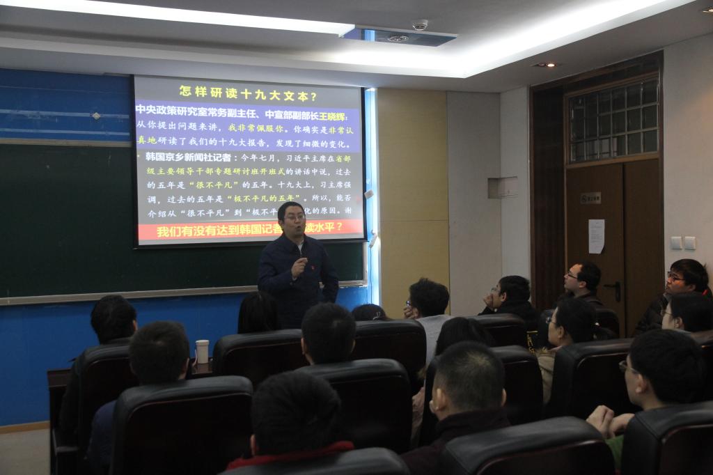 为深入学习宣传贯彻习近平新时代中国特色社会主义思想和党的十九大精神,11月28日下午,学院党委邀请了马克思主义学院高宁老师在主楼321做了题为“谈谈学习十九大精神的一点体会”的学习讲座。学院党委丁丁副书记、一百余位教师和学生党员聆听了讲座。