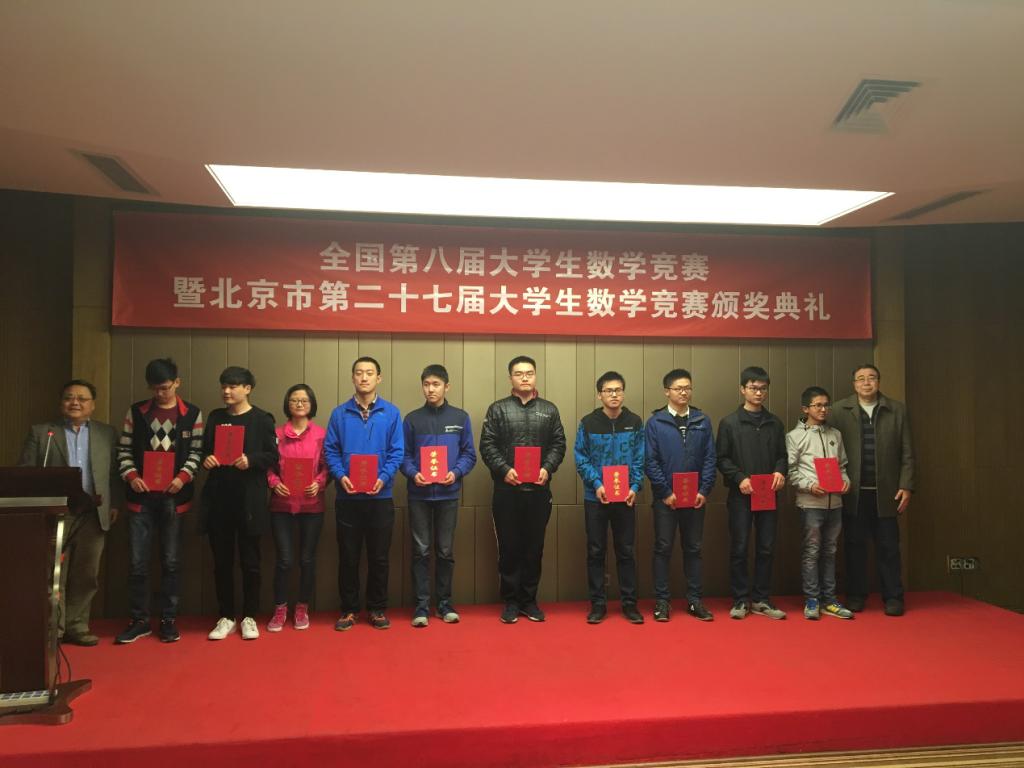 3月12日上午,全国第八届大学生数学竞赛暨北京市第二十届大学生数学竞赛颁奖典礼在中国地质大学举行。我校代表队在非数学类竞赛中有30位同学获得一等奖、39位同学获得二等奖、58位同学获得三等奖;数学类竞赛中有4位同学获得二等奖,9位同学获得三等奖。其中在一等奖获奖人数上,我校获奖人数约占北京市获奖总人数(共98人)的31%。同时我校获得优秀组织奖,数学与系统科学学院李美生老师获得优秀辅导教师奖。