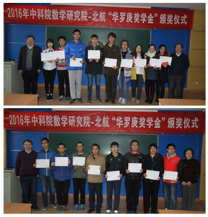 出席此次颁奖仪式的还有中科院研究生部的邵欣老师和刘霞老师,北航数学学院教学副院长杨义川教授、学院教师高宗升教授、漆毅教授和李红裔教授,北航数学学院机教师、辅导员,以及获奖的20名华班同学。自2015年起,中科院数学院与北航联合设立“华罗庚奖学金”,每年从华罗庚班评选出20名优秀学子,每人发放2000元奖金,本次获奖学生的名单如下:赵青,李冠巡,万艺君,王志超,冯亦葳,白瑞祺,杨睿劼,秦国林,苏啸宇,胡杰,沙铜,胡一飞,史庆祥,赵世帆,周郑晔,马骏宇,陈旭阳,陈昱蓉,方泓懿,孙禄 。