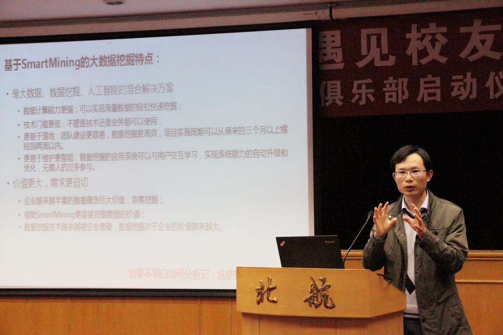 接下来,徐晶校友也分享了自己的心得体会。他对学校表示了深深的怀念,追忆20年前在校的美好时光。在谈到学生俱乐部时,徐晶表示,当今社会在改变我们的生活方式的同时,也给予了我们发展自我的契机。数据挖掘之于大学生,可以成为分析问题的一种解决方式,可以是理解大数据时代的途径,可以成为自己选择的奋斗方向。他希望,能够有更多的同学加入到俱乐部中,体味数据挖掘中的趣味与奥秘。