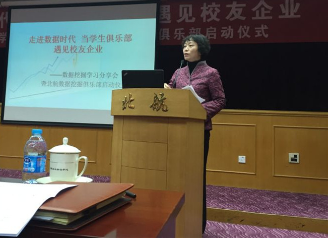 分享会开始,党委书记李红捷首先代表学院,对北航数学学院校友、同学们的师兄、广州思迈特公司副总裁徐晶的到来表示热烈欢迎。李书记表示,数据挖掘作为当今社会一项日益成熟的技术和学科已经被越来越多的人们所关注与学习。今天在校友企业和学院的支持和指导下,希望通过这个分享会,让越来越多的同学走近、了解、学习数据挖掘,期望能够在北航掀起一股学习数据挖掘的潮流。
