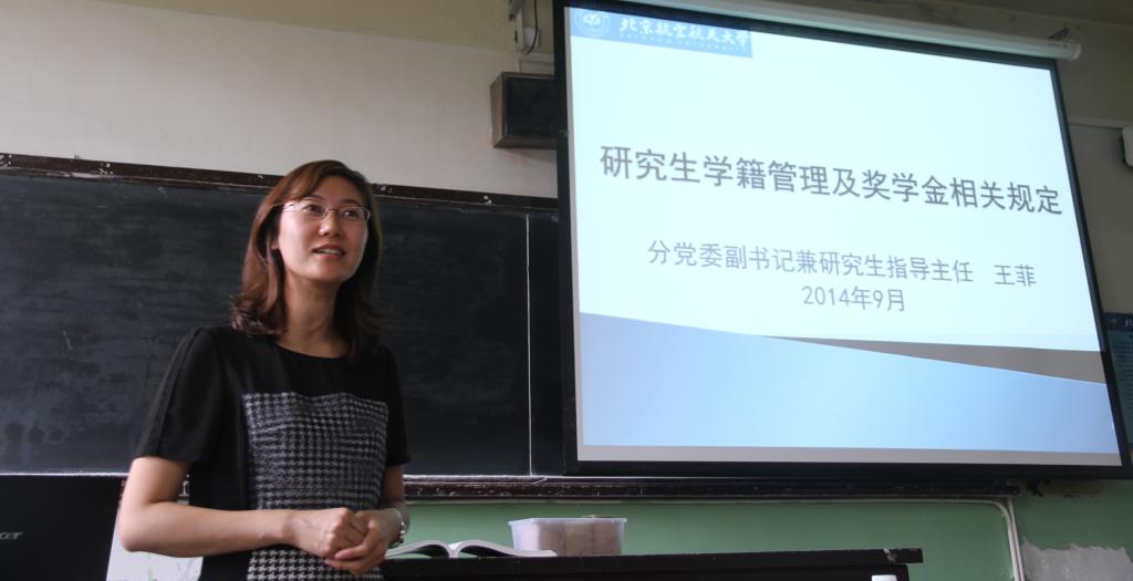 紧接着,王菲老师为大家介绍了我院学生工作相关情况,着重强调了学习上、科研上一定要诚信为本,重点介绍了新的研究生奖学金评定办法,并从方便同学日后工作、生活角度给大家具体说明了几个一定要注意的事项,鼓励大家在学习、科研、生活上积极主动,融入新的环境,创造新成果。