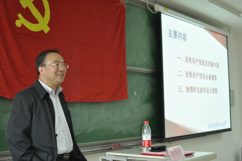 姚书记以历史和自身的海外经历为素材,证明了中国共产党在祖国飞速发展中的重要作用,是历史选择了党,并向学员阐述了三个内容:1、没有共产党,就没有新中国;2、优秀党员必须具备的素质;3、珍惜时光追求远大理想。最后姚书记和同学们分享了一些自己的科研成果,激励大家努力工作,认真学习,发挥学科优势,不断探索科研创新,工作创新,成为对国家有用的人才。