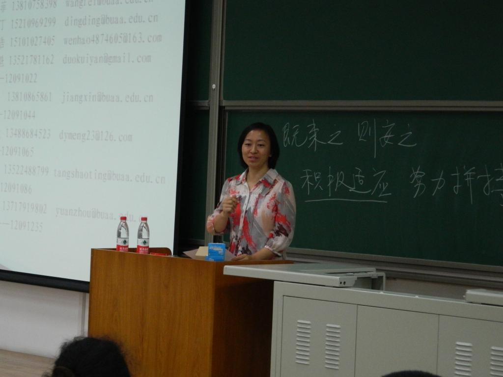 院党委副书记王菲向同学们介绍了学生工作,很好的阐释了学生工作办公室的职能,并在学风建设、党建、奖惩、学籍、安全等方面作了介绍。