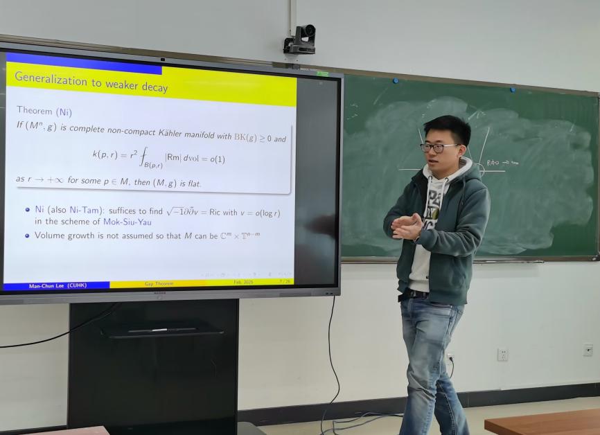 2025年2月20日上午,香港中文大学助理教授李文俊(Man-Chun Lee)受邀为pp电子官方网站师生作了题为“Gap theorem on manifolds using Ricci flow”的学术报告,报告在E404举行,由张世金老师主持。这个报告也是数学学院微分几何讨论班(2025年春季)系列学术报告中的第2讲。