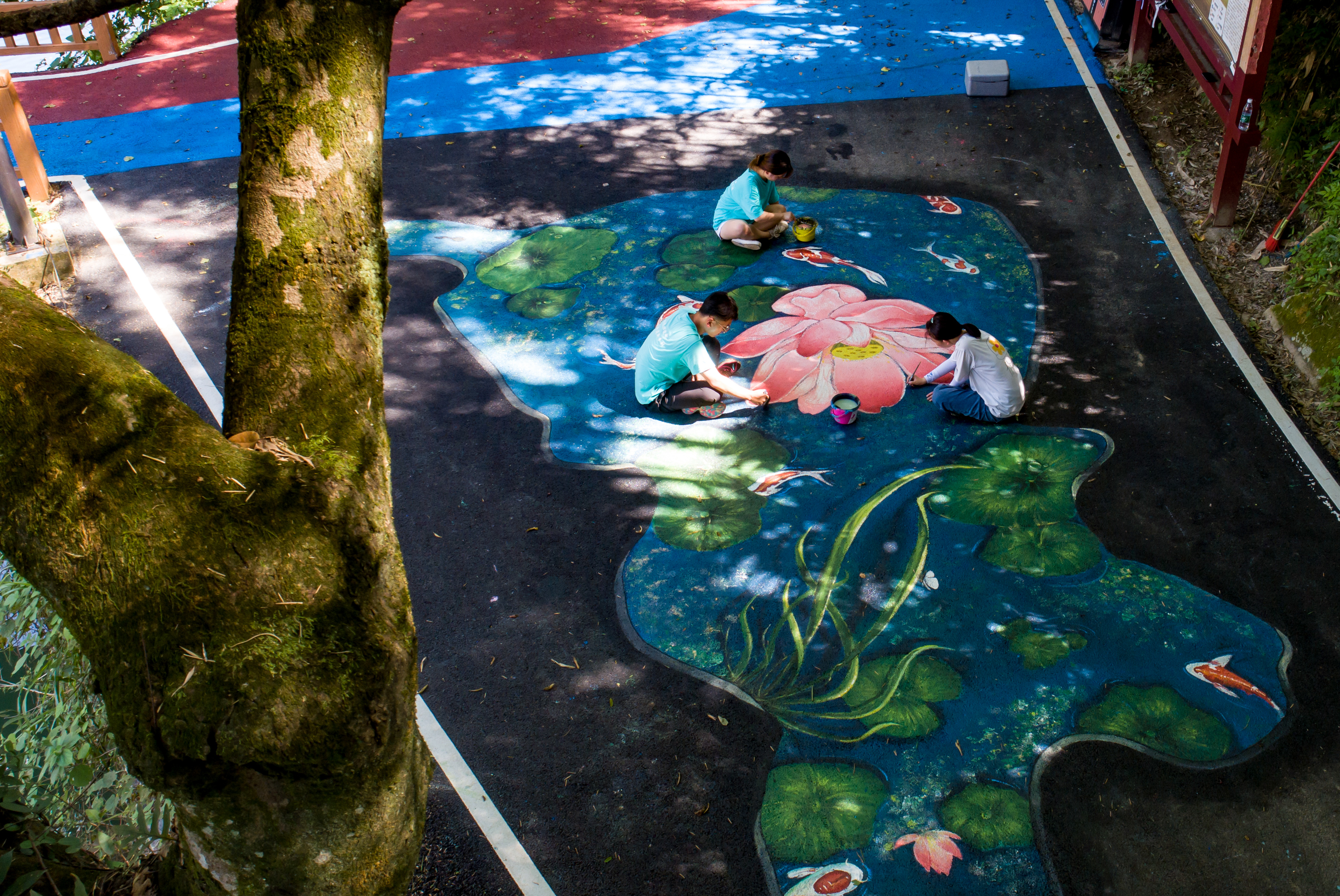 “我掉进荷花池里啦!”木脚村彩虹步道旁,几个孩子嬉戏打闹着,叫声引来众人围观。原来,这群孩子“掉进”的是一幅栩栩如生的3D地面彩绘——鱼戏莲叶图,这个用画笔“挖”成的荷花池,成为了当地村民、游客竞相打卡的网红地。