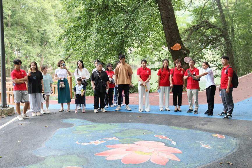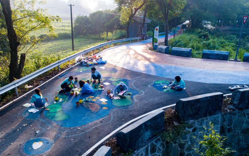 彩绘作品《荷塘凫鸭戏水图》将乌黑的柏油路变成了一方“池塘”,生动别致的荷花与鸭群跃然于眼前,巨幅彩绘与美丽新乡村相得益彰,使木脚村焕发了新颜,来往人群争相驻足留影。“地面上画好看的画,大家散步就都喜欢走到这里来看一看、拍一拍,景美自然心情也美了。”当地村民谈到创意彩绘时,赞不绝口。