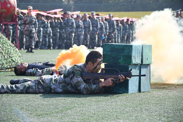 分列式表演结束后,四面鼓声有节奏的响起,主席台上一名教官摇着一面红旗发出开始的号令,本次军训汇演最大的亮点拳术表演以及战术表演相继上演。威廉官网200名新生和其他学院200名新生共同组成的400人拳术队站在田径场正中间,挥出拳头,迈开步伐,开始了军体拳表演。拳如风、步如松,他们动作刚劲、拳脚有力、气势十足、口号浑厚响亮,一套军体拳打出了军人的气势,磅礴的架势。随着豪迈的音乐响起,烟雾弹的烟雾笼罩着田径场中部,一场由军训团教官带来的战术表演在田径场中激烈进行着,战术表演模拟了战场实景、进攻战术与战场救护等科目,现场掌声欢呼声不绝于耳。