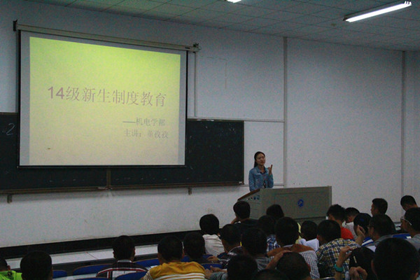 为帮助14级新生快速适应大学生活,威廉官网机电学部于9月20日晚7点30分在一教404室举行了新生入学教育讲座。此次讲座主要分制度教育和党性教育两个环节,由辅导员董孜孜和党务部部长叶俊鸣担任主讲人。