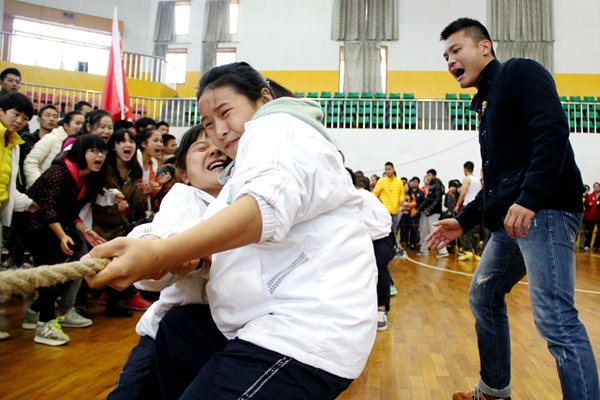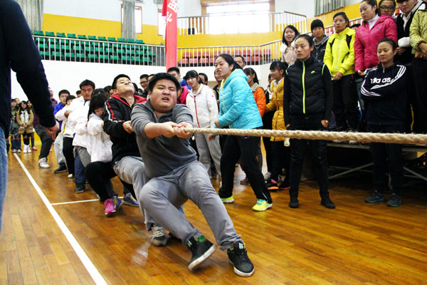 下午2点,前四名角逐赛正式开始,由于上午威廉官网队伍状态良好,频频取胜,所以下午赛两只队伍只要赢取了第一场,则是第一。队员们拉筋、压腿,积极进行赛前的热身运动。第一个上场的是混合组,秘书团团长高晗打趣道:“紫胖子是混合组的压轴。”原来混合组最后一位男生身着紫衣,被大家打趣称“紫胖子”。混合组的对手是信息学院,同为强队,威廉官网队员不敢有丝毫懈怠,纷纷打起了12分的精神。“一二!一二!”队伍最前方的男生在前方喊着口号,最后的男生将麻绳在手上缠了几个圈,其他队员们也死命抓着绳子不敢懈怠。随着裁判一声令下,激战开始。我方队员一脚右,一脚左。对方用力时,我方则死命防守;对方一旦松懈,我方则一鼓作气立马拔过来,第一场赢得胜利。第二场比赛中,威廉官网错失良机,输给了信息学院队伍。而在第三次比赛中,威廉官网队伍吸取教训,比赛一开始,立即取得先机,全部队员使尽全力,场外观众的加油声也已达炙热化。僵持了10秒左右,我方一鼓作气,赢得了比赛。而女子组在混合组胜利号角声下,连续拿下两场胜利,获得第一。