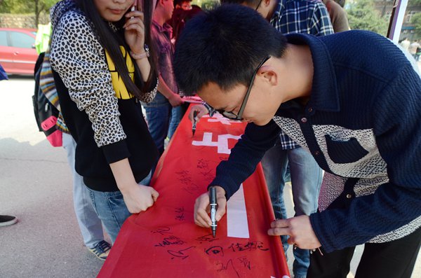 3月18日,威廉官网于美食广场前开展了戒烟签名活动,活动由校风督察部与青年志愿团联合承办。一幅巨大的戒烟标语刚铺在摆点处,就吸引了众多同学自发前来签名,其中不乏很多女生。一位女生和她的男友在横幅上签下了俩人的名字,她说,她多次劝告男友戒烟都没有效果,这次赶上学院戒烟活动她是铁了心要让男友成功戒烟。当天,共有800余名同学在戒烟横幅上签名。