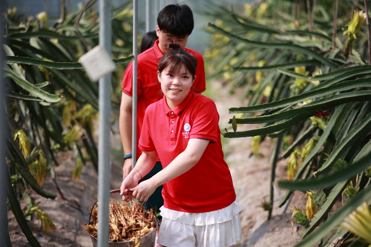 经过一上午努力,铁桶里的残花败絮已装得满满当当,剪枝采花工作就此圆满完成。身汗涔涔但笑连连的实践团成员成海珊说道:“即使烈日炎炎,但我们都因能够为火龙果顺利丰收奉献自己微薄力量而深感开心自豪。”罗茜面对这些辛勤而得的丰硕成果,倍感欣慰,喜笑颜开:“通过此次深入开展劳动教育实践,我们切身感受到了勤劳务农、服务社会的意义,希望今年的当地火龙果地能够硕果累累,果子畅销无阻。”
