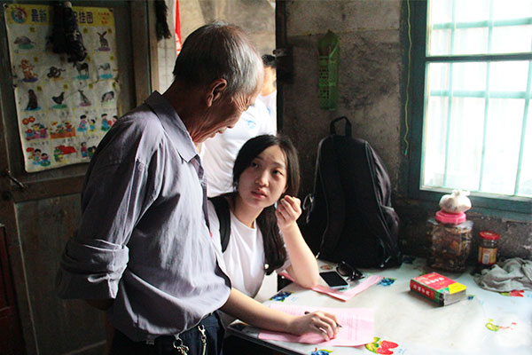 通过志愿者挨家挨户的敲门解说,村民们对此次调研活动逐渐理解,并配合填写调查问卷。“爷爷,请问您最担心孩子哪一方面?身体健康、交友情况还是学习情况?”由于很多老人并不识字,调研组的成员们只能一个字一个字十分耐心地念给老人们听。