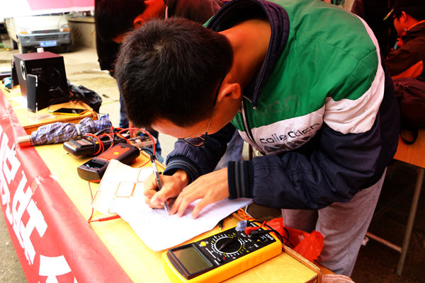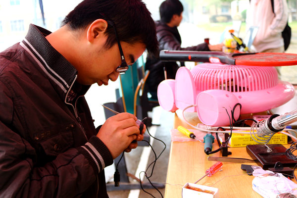 29日早晨六点左右,八区摆点处负责人陈长富带着委员们开始着手准备摆点工具,借来桌子,从宿舍搬来凳子,接通电源……八点,义务维修正式开始。不一会就有同学陆续送来了需要维修的电器,台灯、插板、电脑、吹风机、电风扇、收音机等摆满了整个桌子。