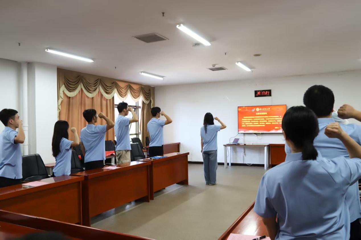 23体教三班吴敬翔作为学生代表发言。他向关心支持活动的学院领导、老师表达诚挚感谢,感谢学院给大家提供了暑期“三下乡”社会实践活动这个锻炼机会,帮助同学们提前接触社会、锻炼实践与社交能力、培养社会责任感。他号召所有参加此次暑期“三下乡”社会实践活动的同学:“珍惜此次实践机会,在实践中锤炼本领,提升自我,以实际行动践行服务社会的理念,用青年的热血与才智为本次活动增添活力。”接着,在马婧雯的带领下,实践团队全体成员进行庄严宣誓,铿锵誓言彰显投身实践、践行使命的坚定信念。